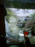 そのまた狭いテーブルに水槽置いて小分けでゼリーの入ってたビニール容器やプリンカップ、その他荷物も置いて。